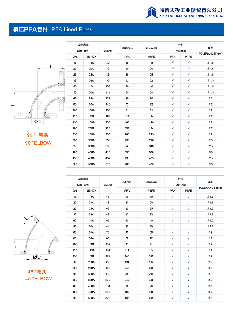 本公司的模壓PFA管件,采用耐強腐蝕的PFA材料,具有高密度、高強度和襯層厚度均勻等特點。每一個尺寸要求都精確控制,從模具加工精度到成型后的氟塑料加工精度都精益求精。